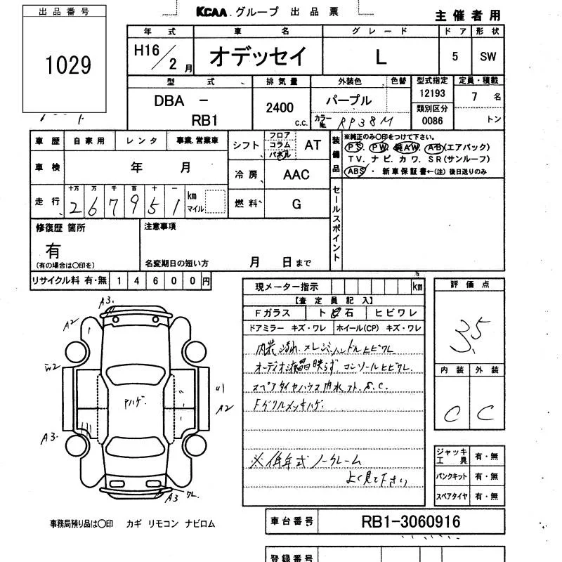 Honda ODYSSEY с аукциона Японии KCAA Minami Kyushu лот № 1029