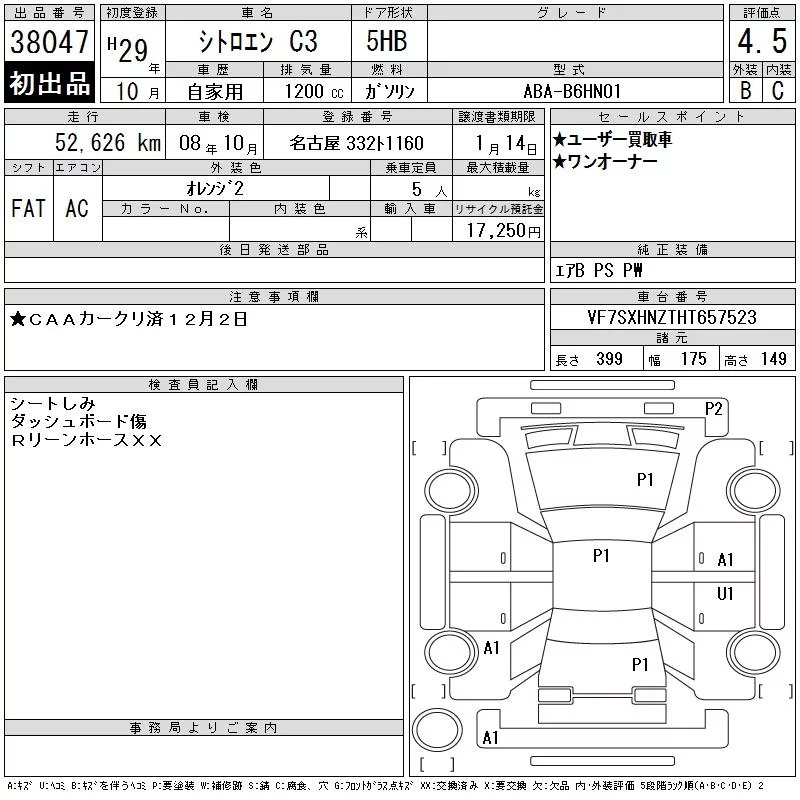 Citroen C3 с аукциона Японии CAA Chubu лот № 38047