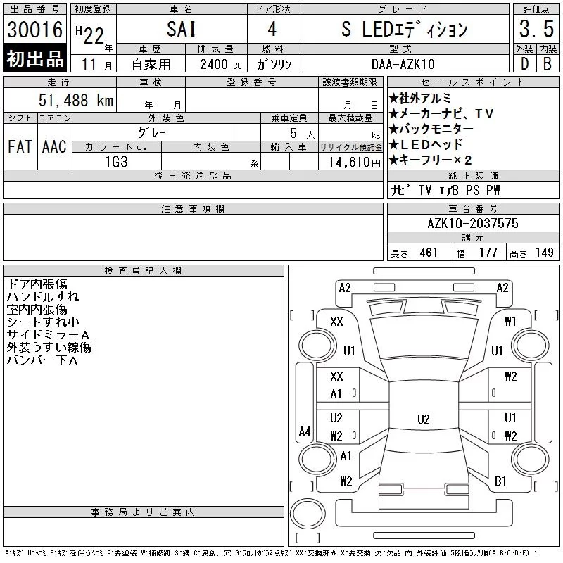 Toyota SAI с аукциона Японии CAA Chubu лот № 30016