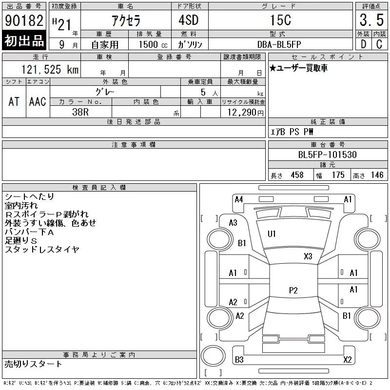 Mazda AXELA с аукциона Японии CAA Chubu лот № 90182