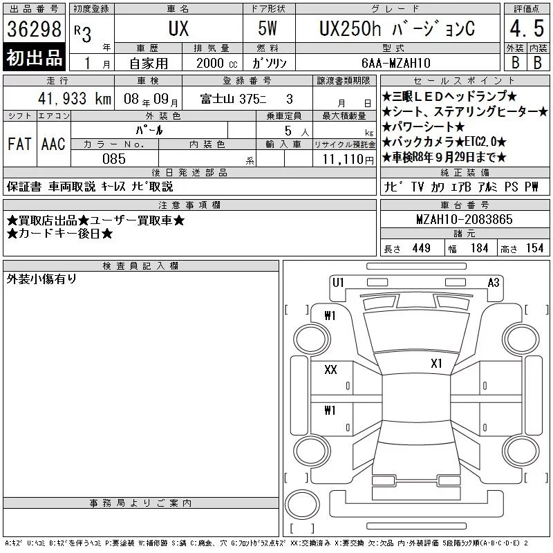 Lexus UX с аукциона Японии CAA Chubu лот № 36298