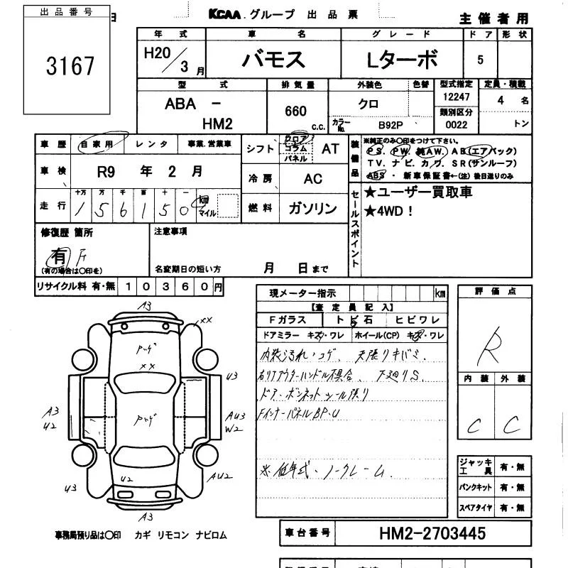Honda VAMOS с аукциона Японии KCAA Minami Kyushu лот № 3167