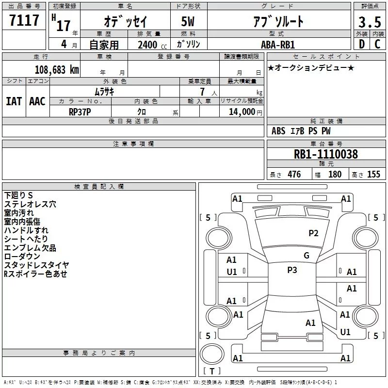 Honda ODYSSEY с аукциона Японии TAA Tohoku лот № 7117