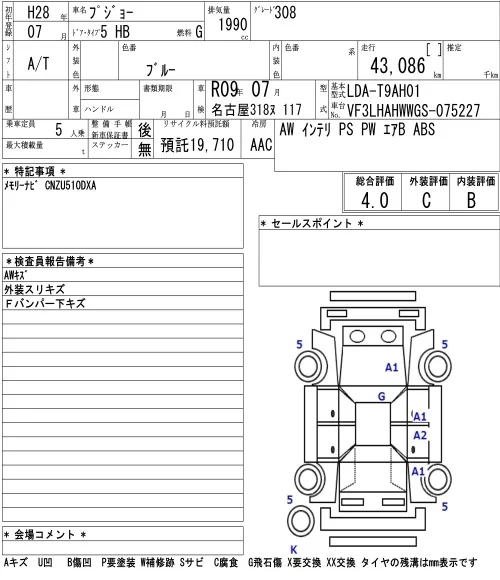 Peugeot 308 с аукциона Японии NAA Nagoya лот № 4085