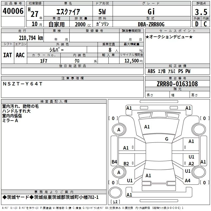 Toyota ESQUIRE с аукциона Японии TAA Kanto лот № 40006