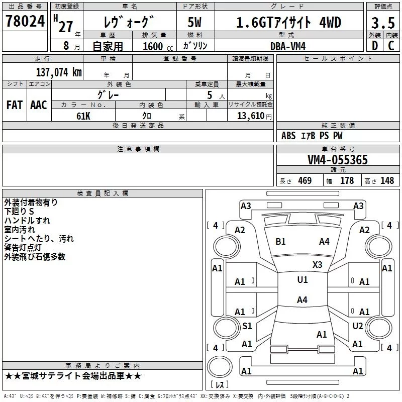 Subaru LEVORG с аукциона Японии TAA Tohoku лот № 78024