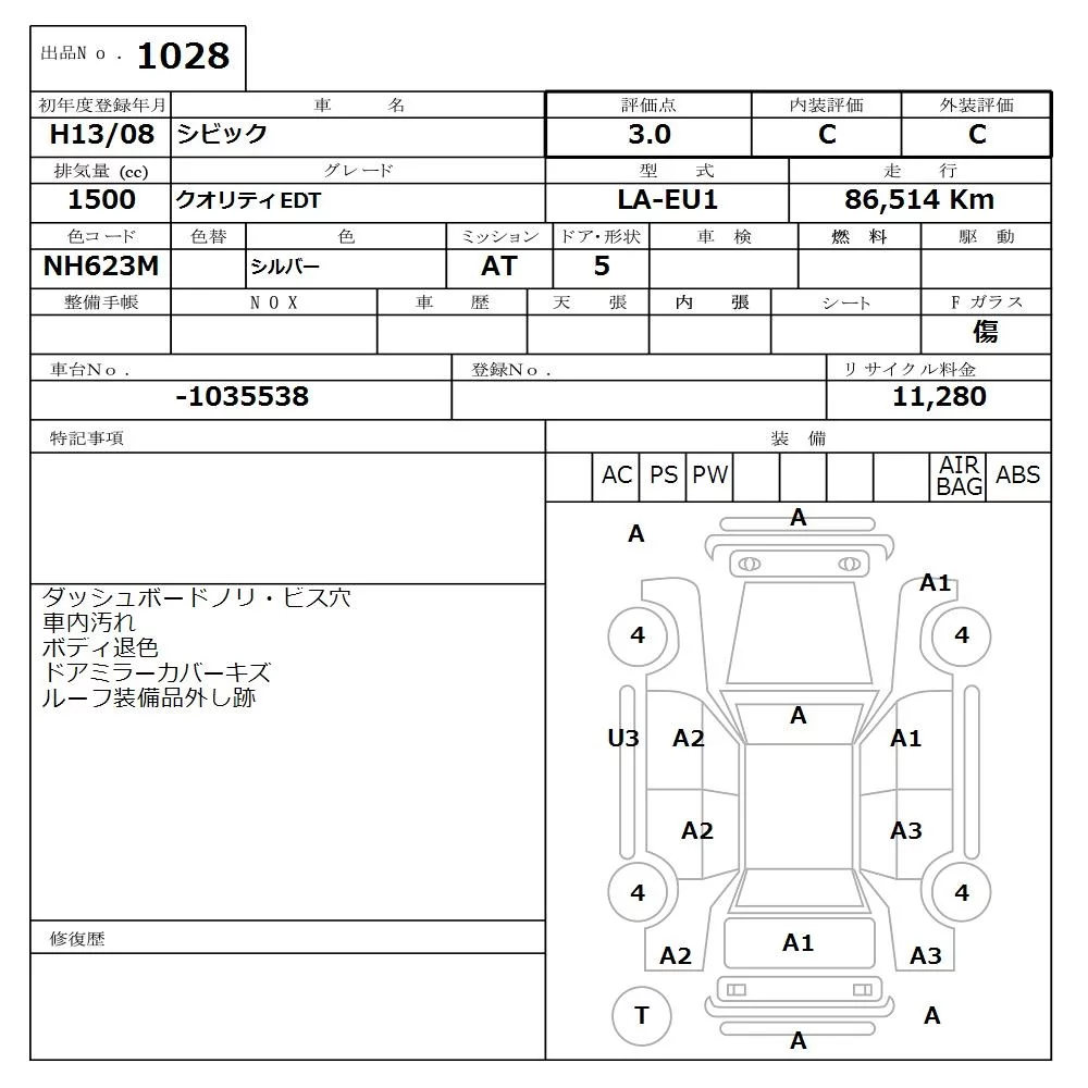 Honda CIVIC с аукциона Японии NISSAN Osaka лот № 1028