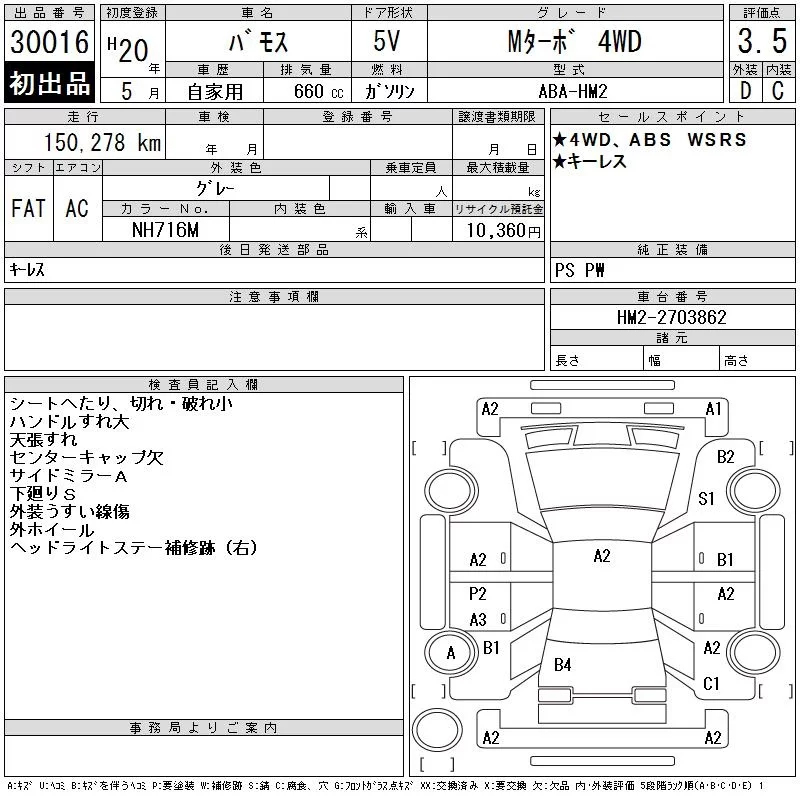 Honda VAMOS с аукциона Японии CAA Gifu лот № 30016