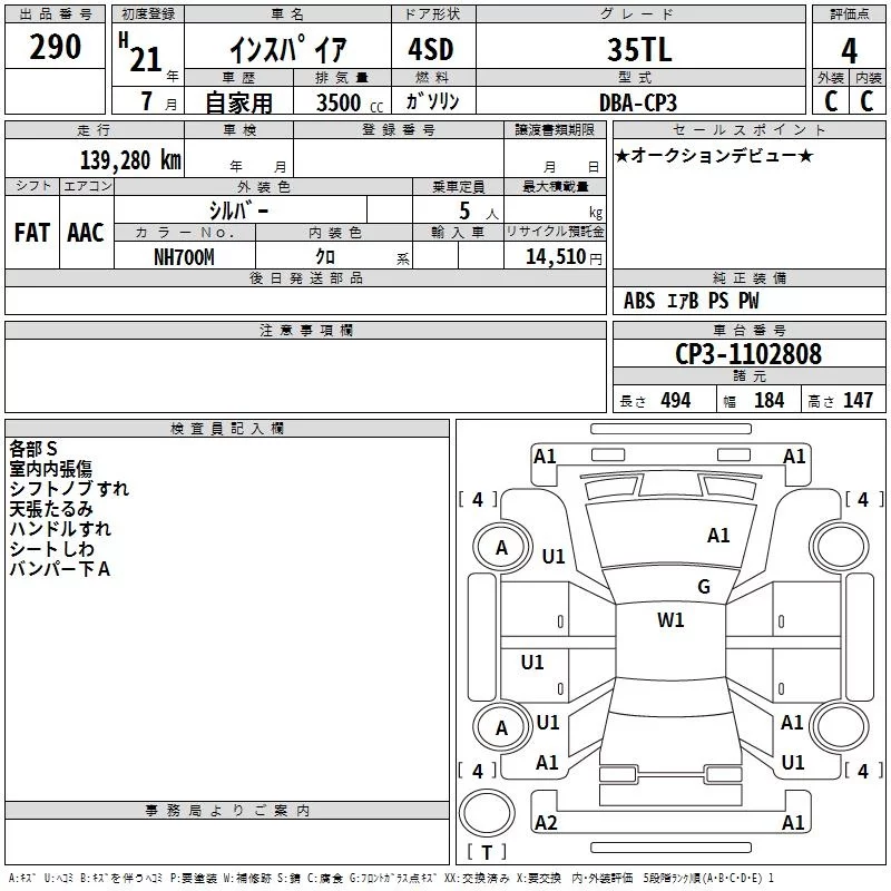Honda INSPIRE с аукциона Японии TAA Kinki лот № 290