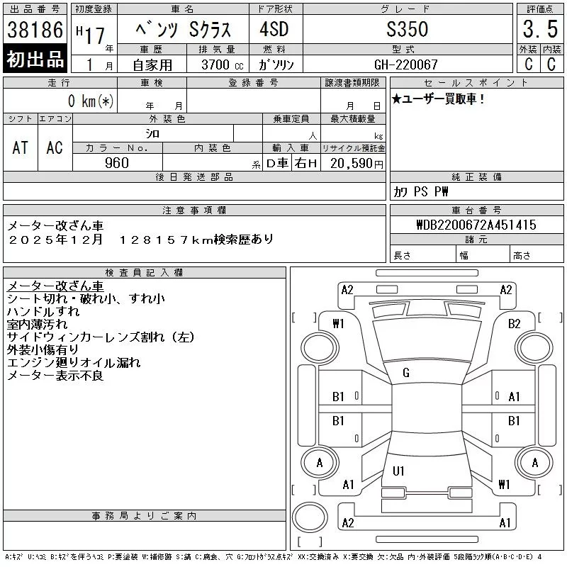 Mercedes-Benz S CLASS с аукциона Японии CAA Tokyo лот № 38186