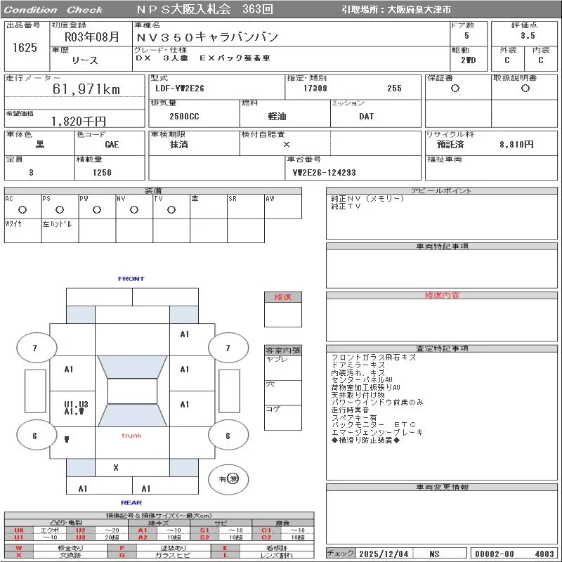 Nissan CARAVAN VAN с аукциона Японии NPS Osaka Nyusatsu лот № 1625