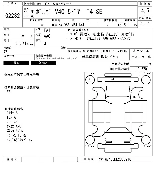 Volvo V40 с аукциона Японии ARAI Bayside лот № 2232