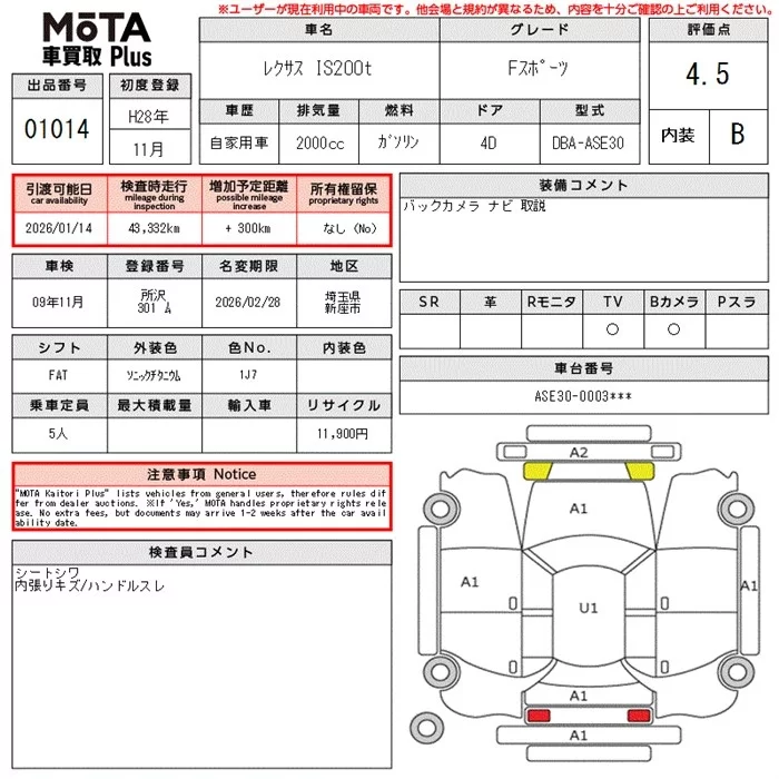 Lexus IS с аукциона Японии MOTA Kuruma Kaitori Plus лот № 1014