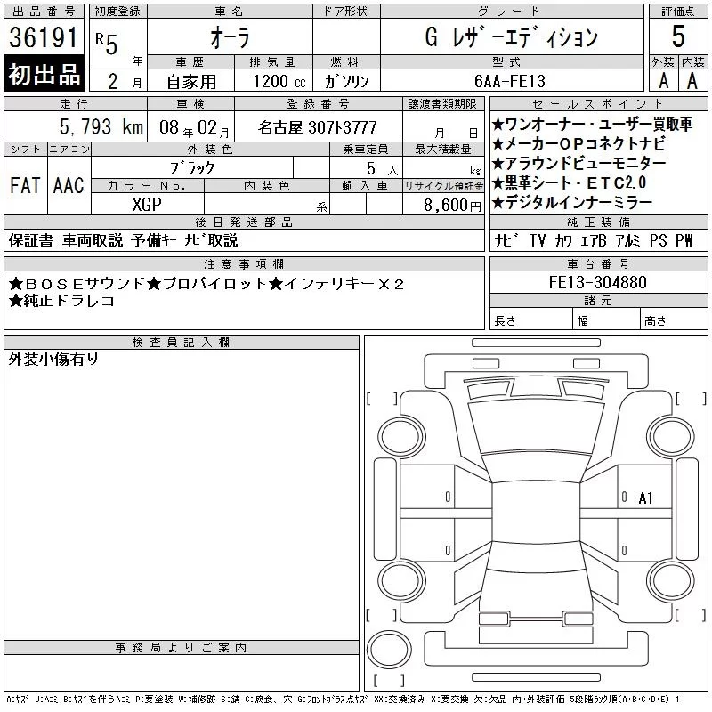 Nissan AURA с аукциона Японии CAA Chubu лот № 36191