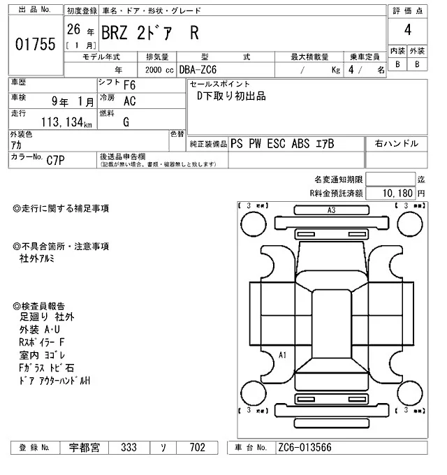 Subaru BRZ с аукциона Японии ARAI Oyama лот № 1755