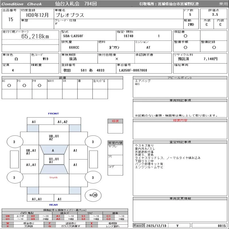 Subaru PLEO PLUS с аукциона Японии ORIX Sendai Nyusatsu лот № 15