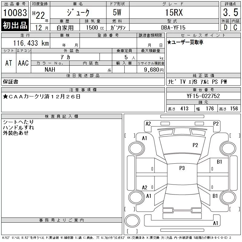 Nissan JUKE с аукциона Японии CAA Chubu лот № 10083