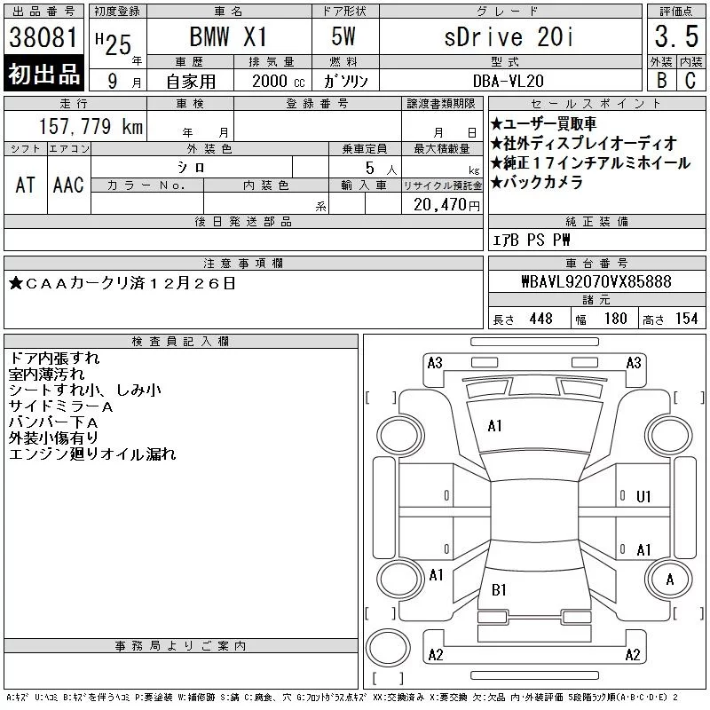 BMW X1 с аукциона Японии CAA Chubu лот № 38081