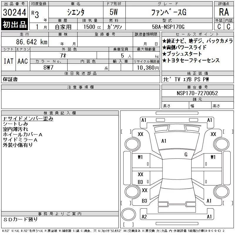 Toyota SIENTA с аукциона Японии CAA Chubu лот № 30244