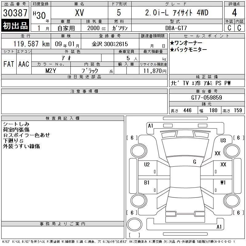 Subaru XV с аукциона Японии CAA Chubu лот № 30387