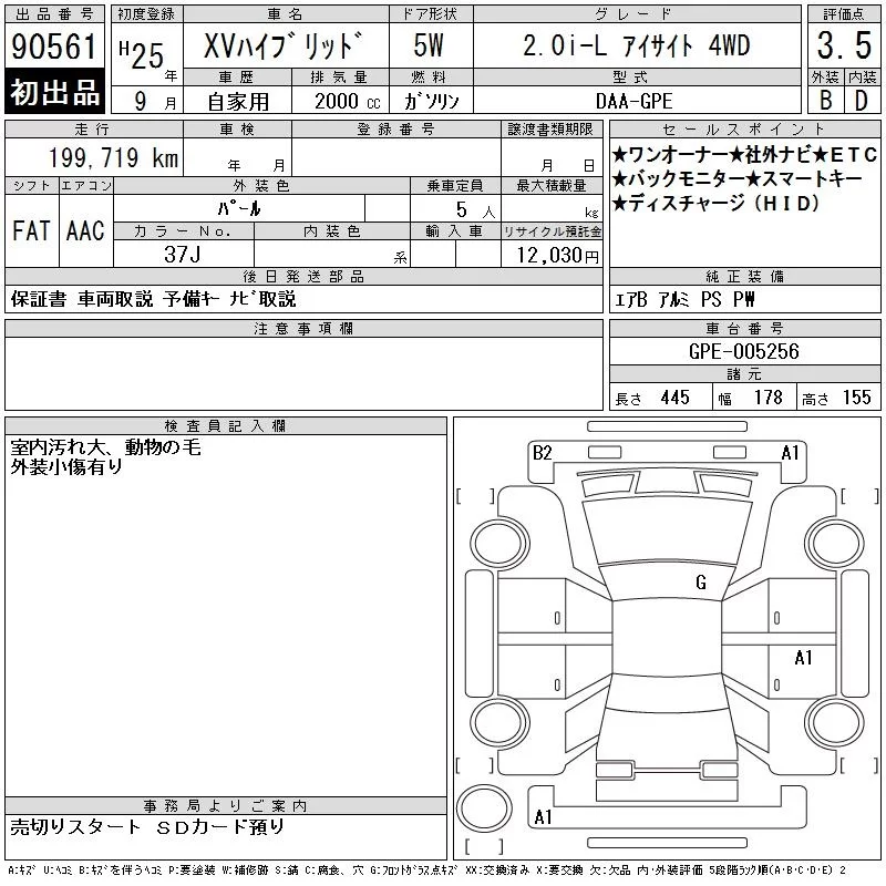 Subaru XV с аукциона Японии CAA Chubu лот № 90561