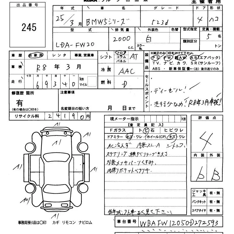 BMW 5-Series с аукциона Японии KCAA Minami Kyushu лот № 245