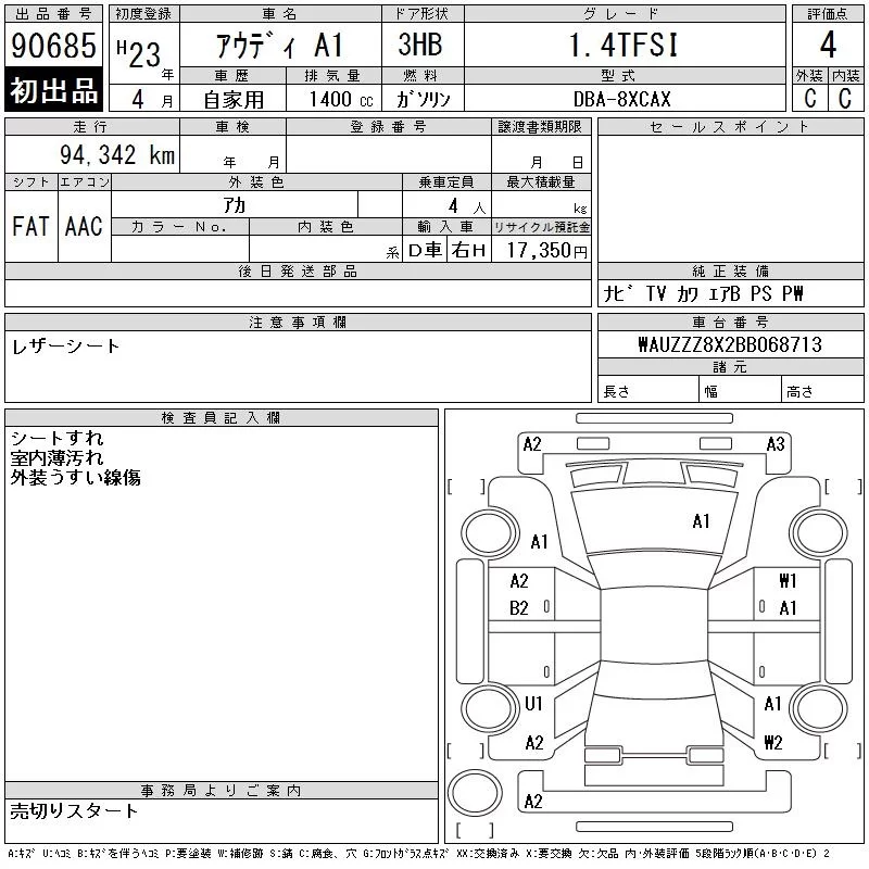 Audi A1 с аукциона Японии CAA Chubu лот № 90685
