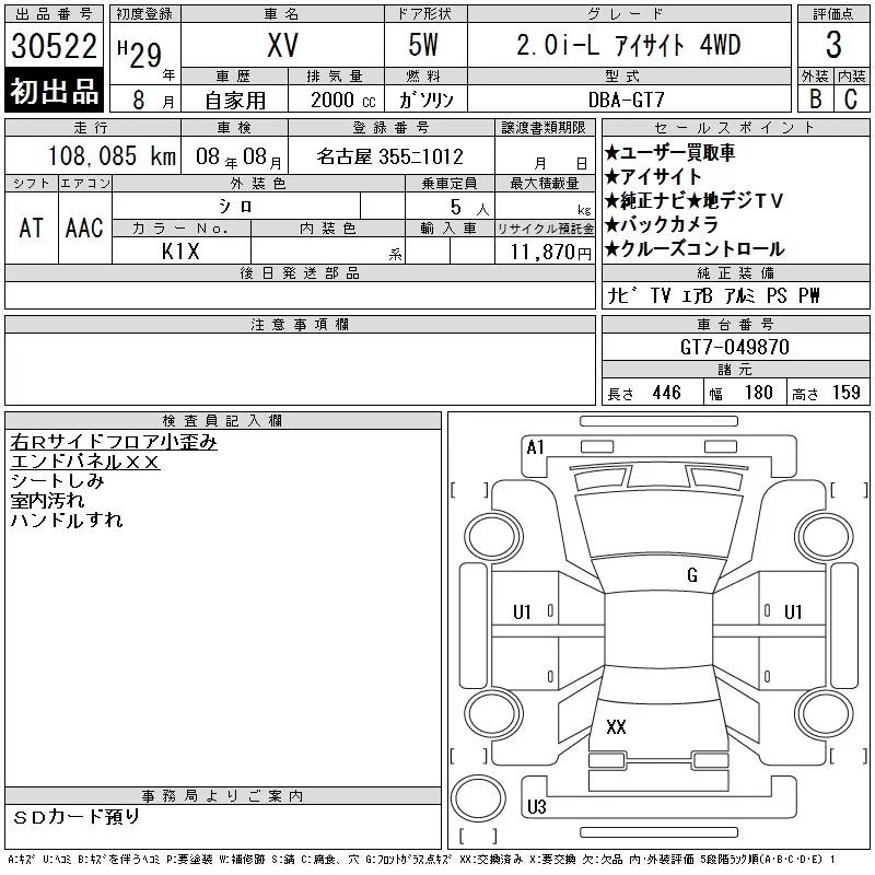 Subaru XV с аукциона Японии CAA Chubu лот № 30522