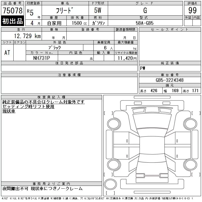 Honda FREED с аукциона Японии CAA Chubu лот № 75078