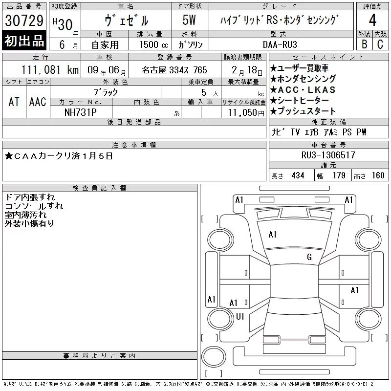 Honda VEZEL с аукциона Японии CAA Chubu лот № 30729