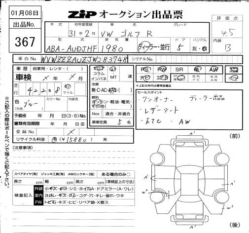 Volkswagen GOLF с аукциона Японии ZIP Osaka лот № 367