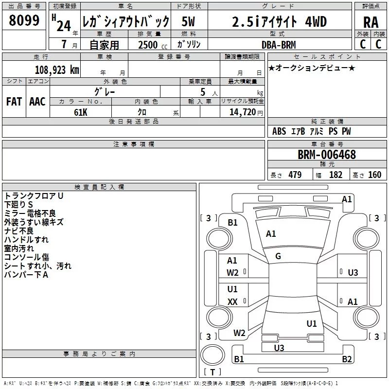 Subaru LEGACY OUTBACK с аукциона Японии TAA Chubu лот № 8099