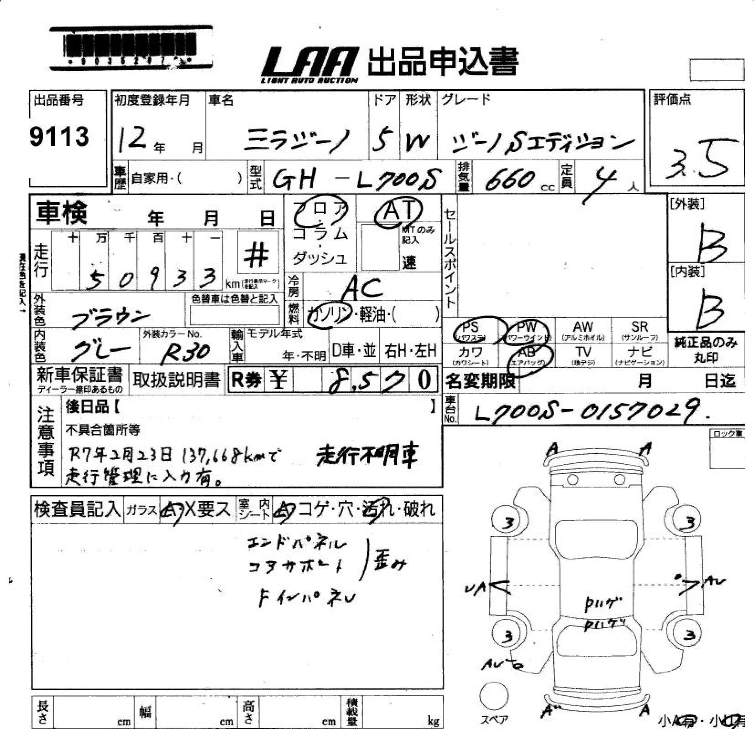Daihatsu MIRA с аукциона Японии LAA Okayama лот № 9113