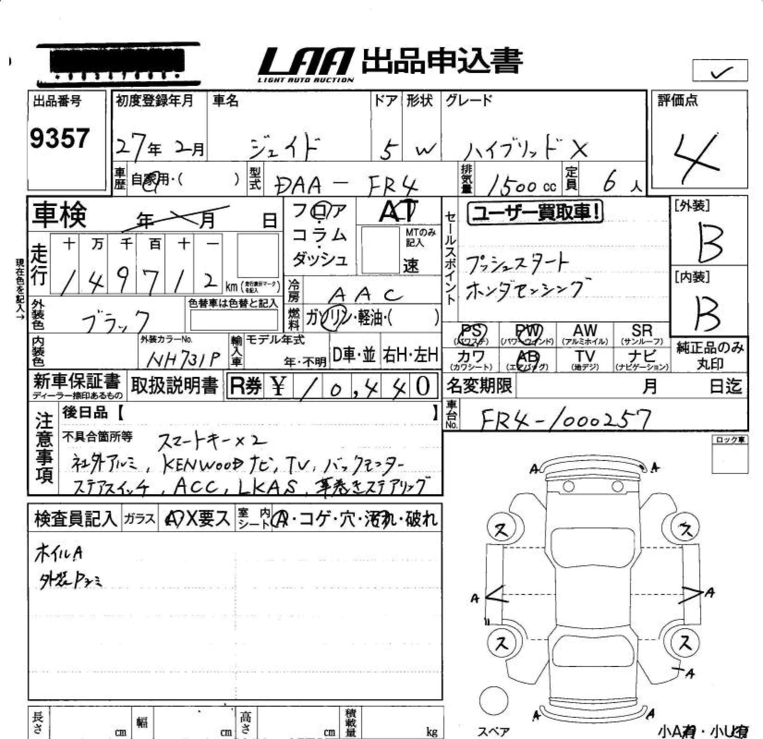 Honda JADE с аукциона Японии LAA Okayama лот № 9357