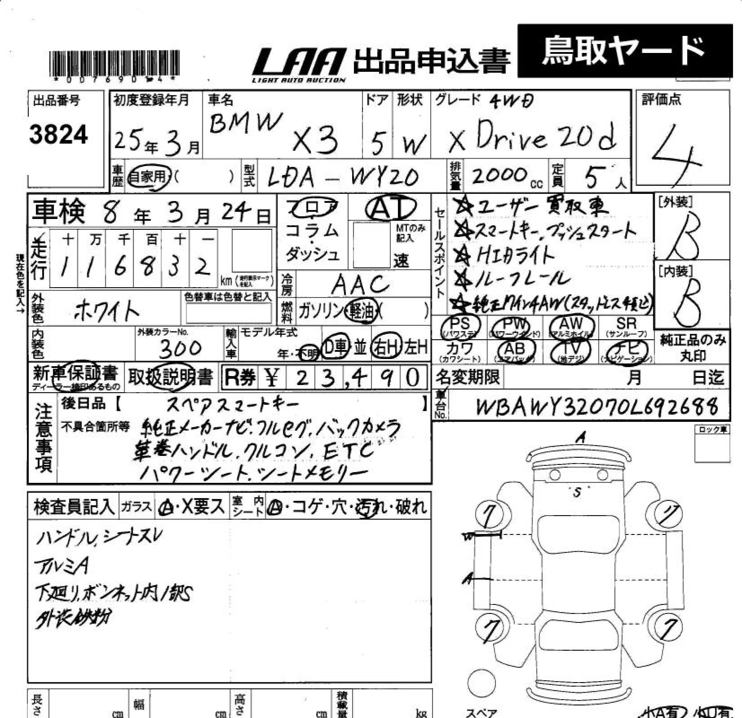 BMW X3 с аукциона Японии LAA Okayama лот № 3824
