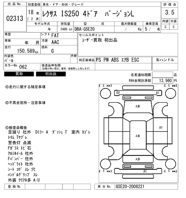 Lexus IS с аукциона Японии ARAI Bayside лот № 2313