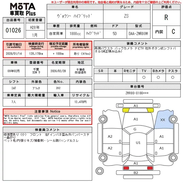 Toyota VOXY с аукциона Японии MOTA Kuruma Kaitori Plus лот № 1026