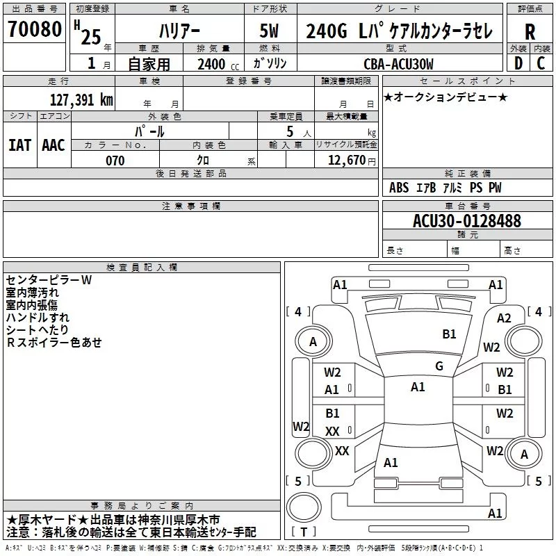 Toyota HARRIER с аукциона Японии TAA Yokohama лот № 70080