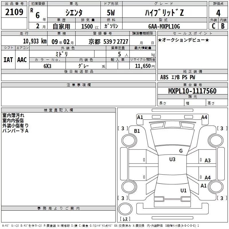 Toyota SIENTA с аукциона Японии TAA Hyogo лот № 2109