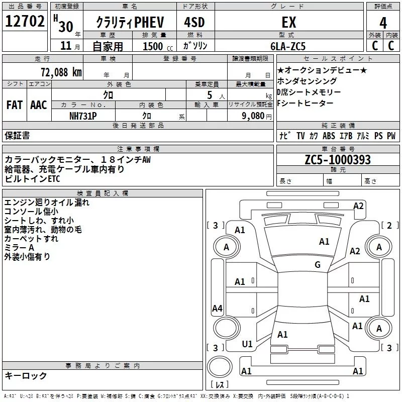 Honda CLARITY с аукциона Японии TAA Yokohama лот № 12702