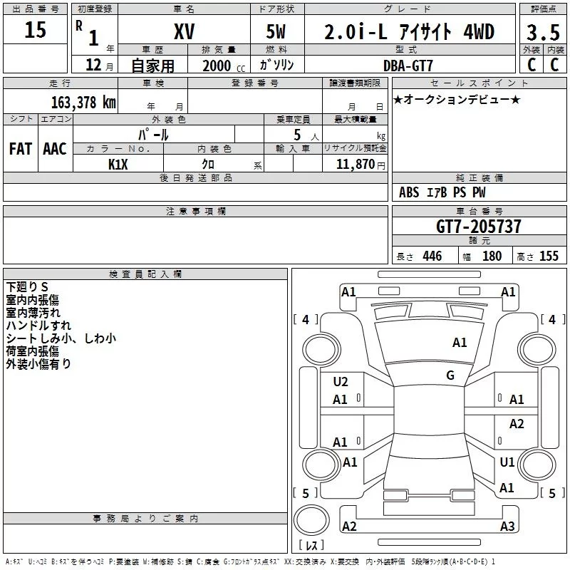 Subaru XV с аукциона Японии TAA Hiroshima лот № 15