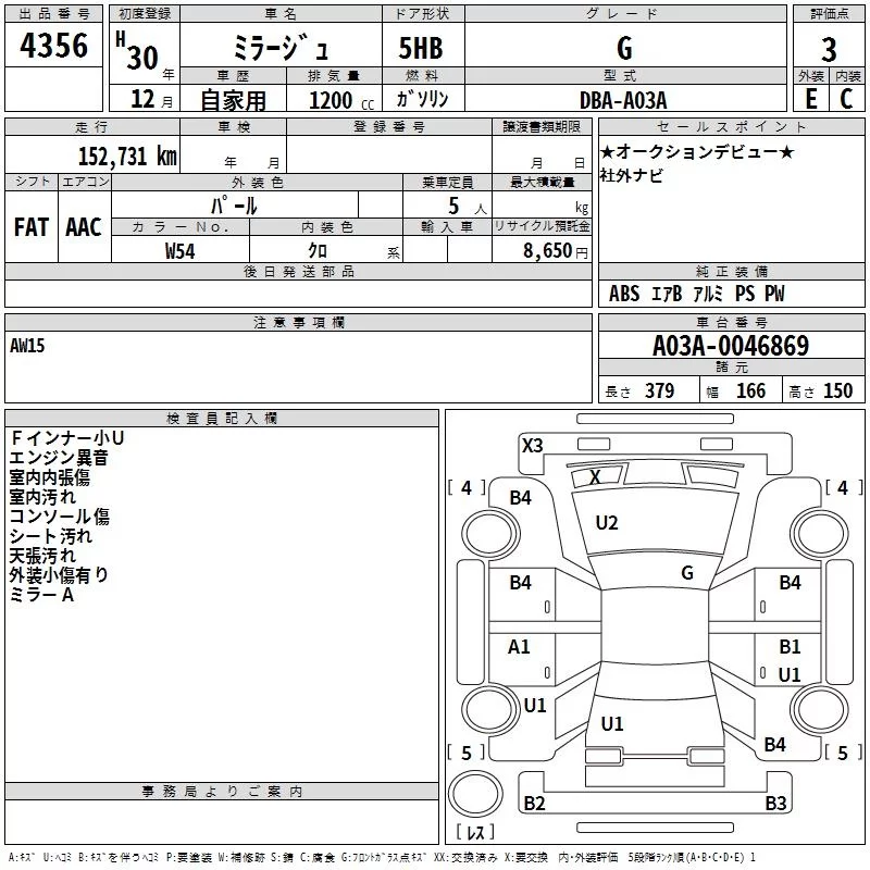 Mitsubishi MIRAGE с аукциона Японии TAA Hiroshima лот № 4356