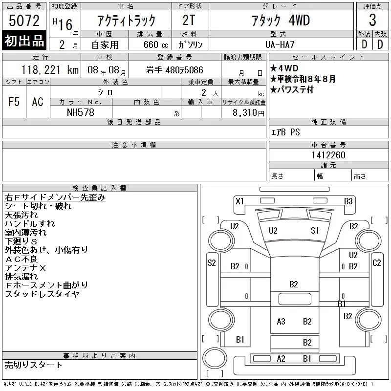 Honda ACTY TRUCK с аукциона Японии CAA Tohoku лот № 5072