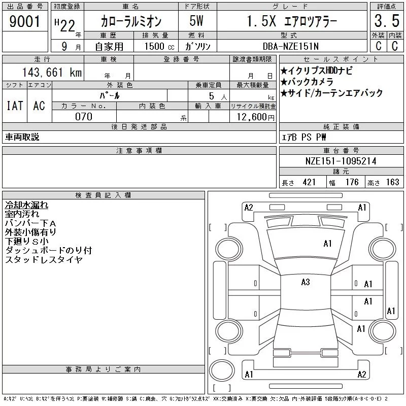 Toyota COROLLA RUMION с аукциона Японии CAA Tohoku лот № 9001