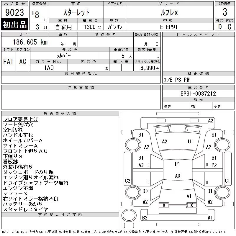 Toyota STARLET с аукциона Японии CAA Tohoku лот № 9023