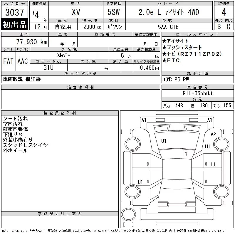 Subaru XV с аукциона Японии CAA Tohoku лот № 3037