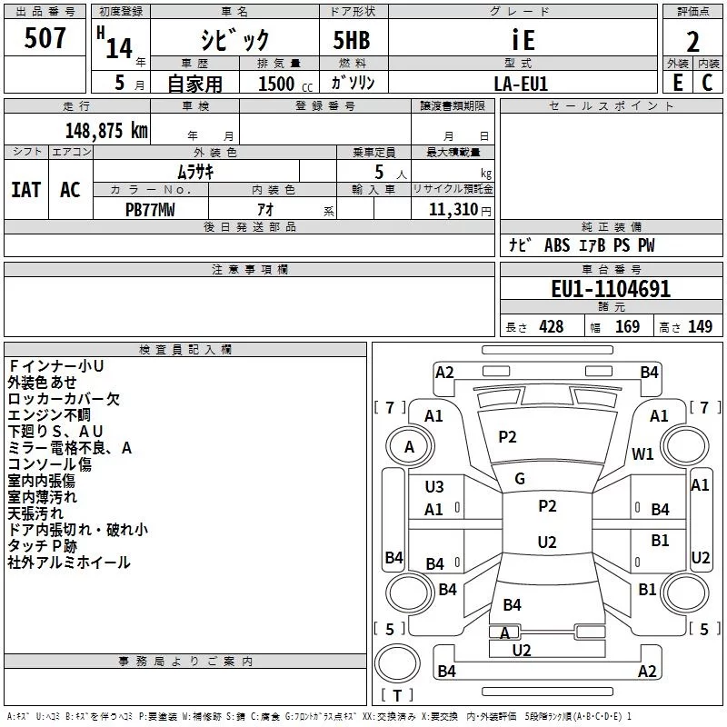 Honda CIVIC с аукциона Японии TAA Hiroshima лот № 507