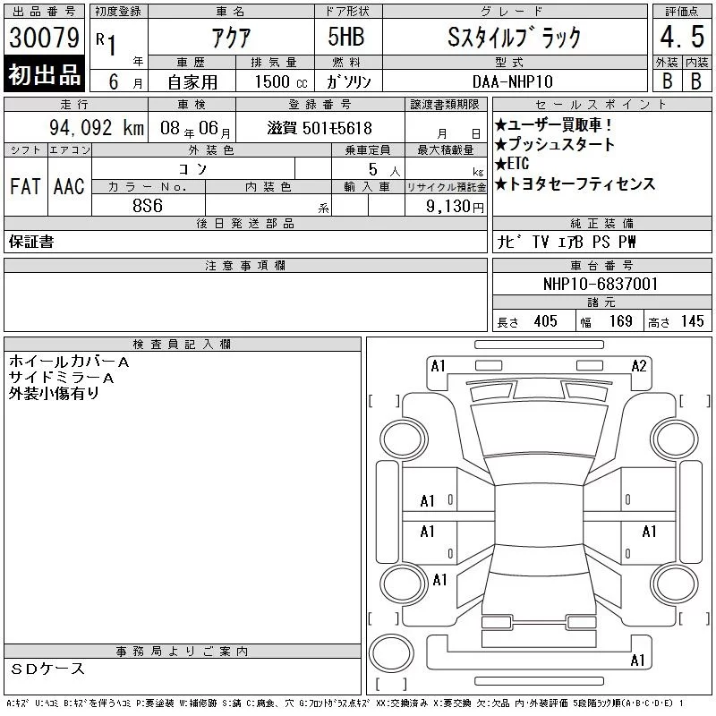 Toyota AQUA с аукциона Японии CAA Gifu лот № 30079