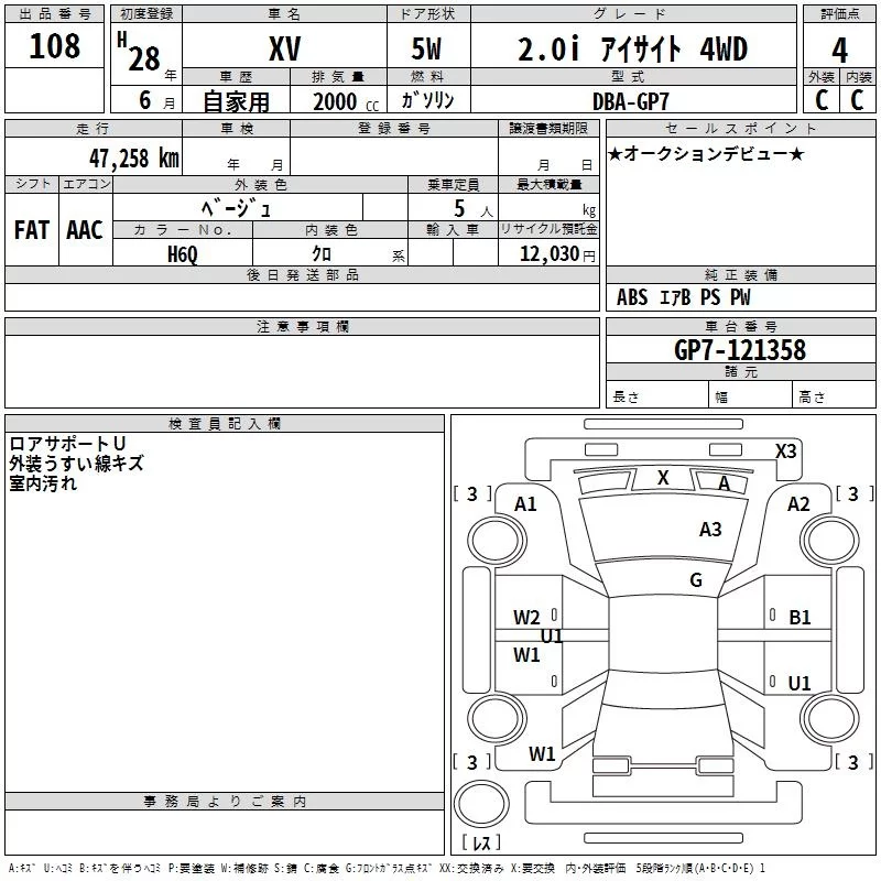 Subaru XV с аукциона Японии TAA Kyushu лот № 108