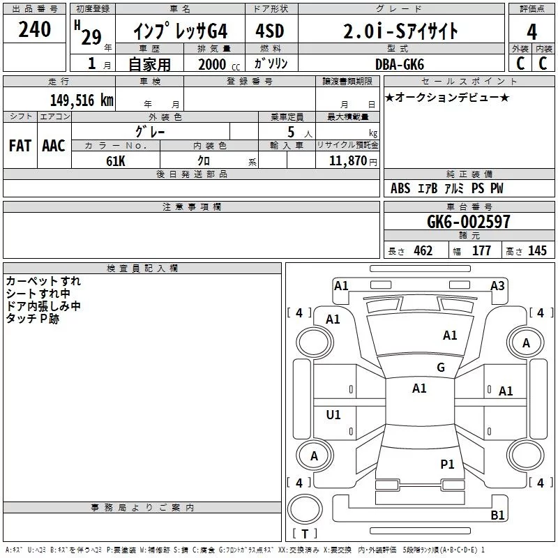 Subaru IMPREZA G4 с аукциона Японии TAA Shikoku лот № 240